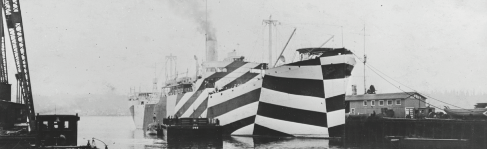 It was not until she was within half a mile that I could make out she was one ship [not several] steering a course at right angles, crossing from starboard to port. The dark painted stripes on her after part made her stern appear her bow, and a broad cut of green paint amidships looks like a patch of water. The weather was bright and visibility good; this was the best camouflage I have ever seen. TESTIMONY OF A U-BOAT CAPTAIN