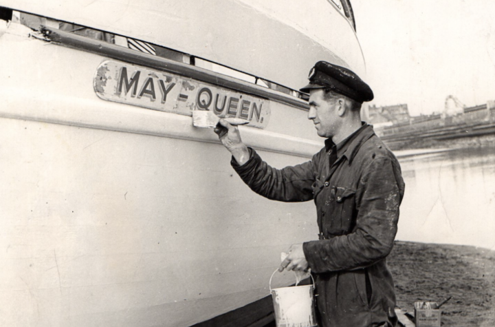 At the end of the war, May Queen was returned to the builders, and though she apparently looked a sorry sight, covered in black paint and with holes in her decks from the fire pumps, she was restored at the expense of the government to her former varnished glory, and began working off the beaches in 1946.