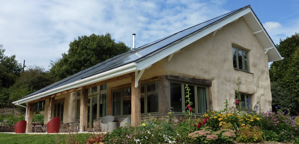 We built our zero carbon eco-house Lowen in 2011. Lowen was made from reclaimed timber and lime rendered straw bales and is carbon neutral and energy self-sufficient. Using PV panels and a ground source heat pump to provide electricity, heating and hot water to the house, Lowen generates enough electricity to power itself plus two other cottages and send energy back to the grid.