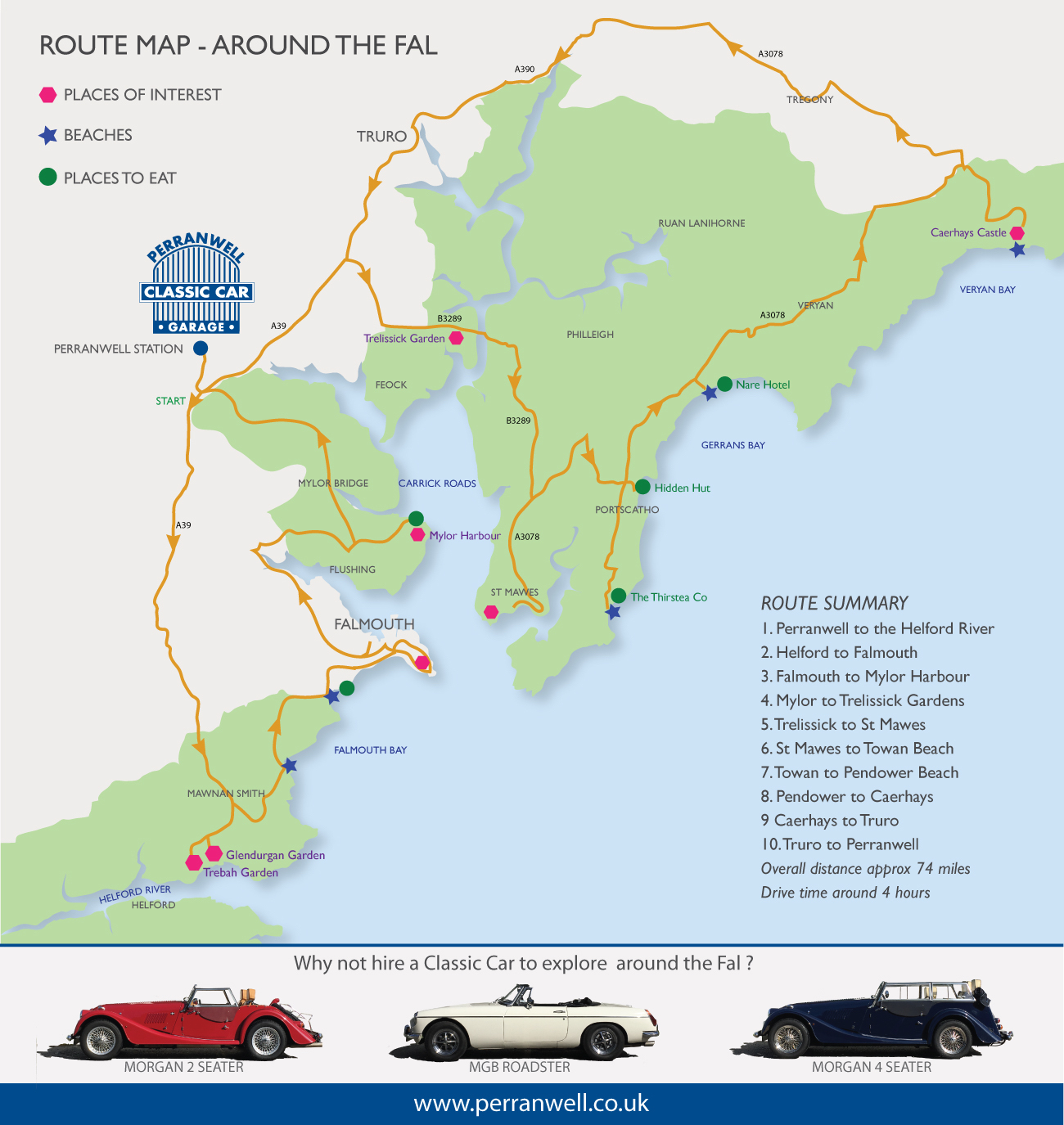 Perranwell Garage have put together this a route around the Fal so you can explore this amazing part of Cornwall in one of their classic open top sportscars. Scroll down to see Short Break Autumn Hire Offer and start planning your adventure.
