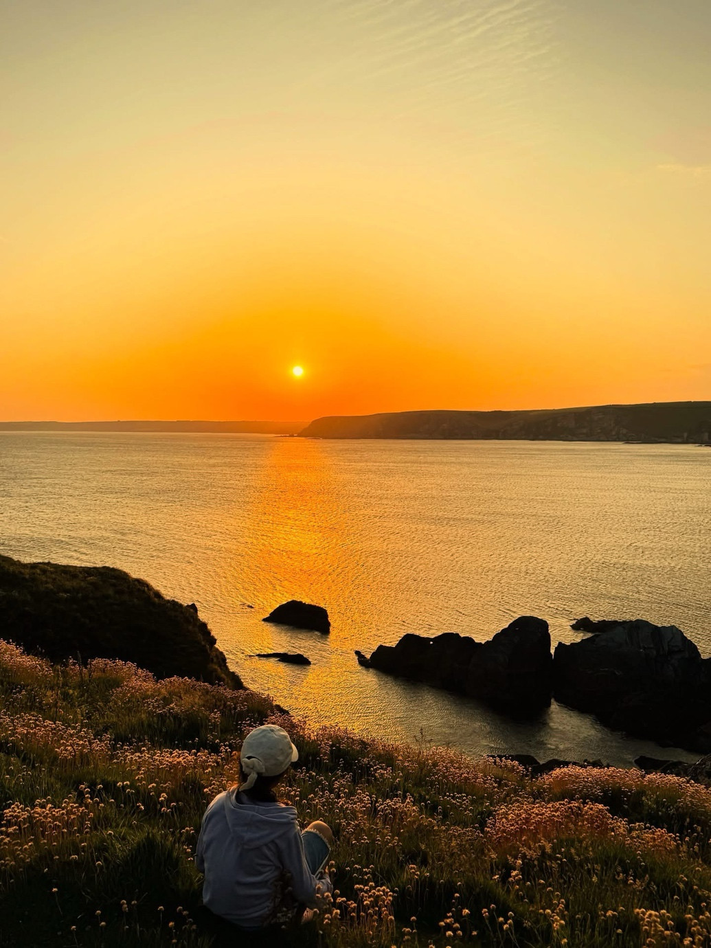 The low light enhances the atmosphere, casting a soft, warm glow that brings a delicate tenderness to the landscape. The thrifts in full bloom add vibrancy and texture, evoking the richness of early summer. Altogether, the photograph captures the essence of warm, inviting days along the coast path—a serene and immersive celebration of nature at its most welcoming.”