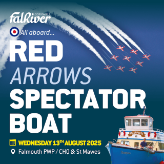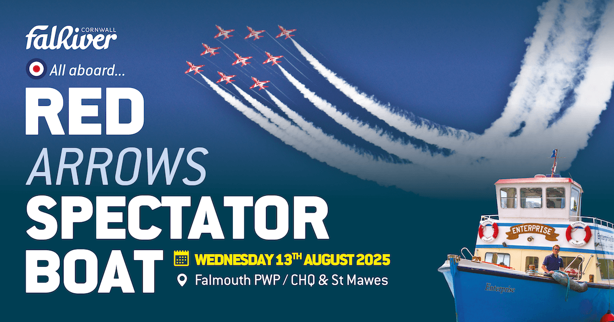 The Red Arrows will fly over Falmouth Bay at 6:15pm on Wednesday, August 13th 2025.