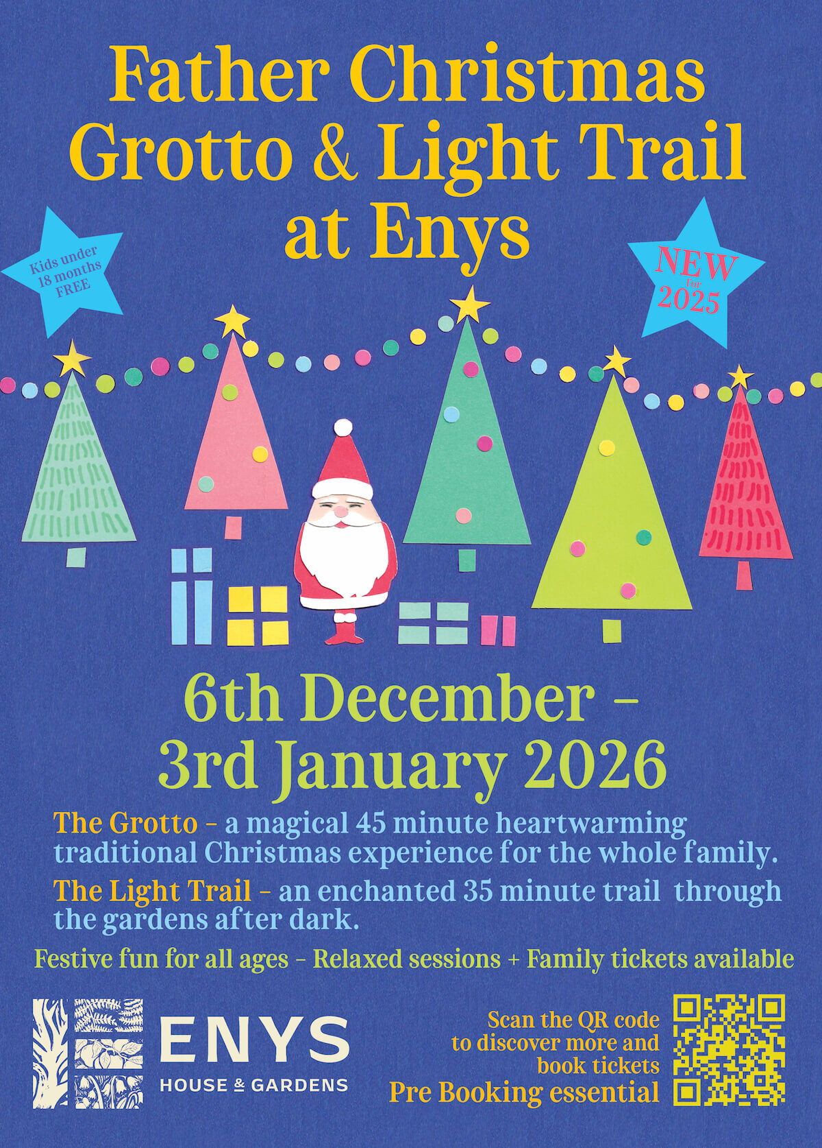 Experience the magic of Christmas at Enys with Father Christmas in his grotto and a stunning illuminated trail through the historic gardens.