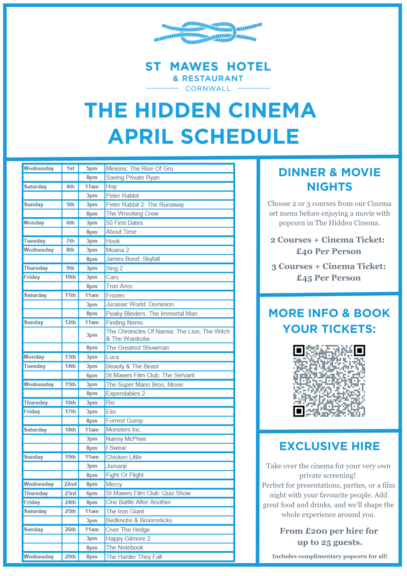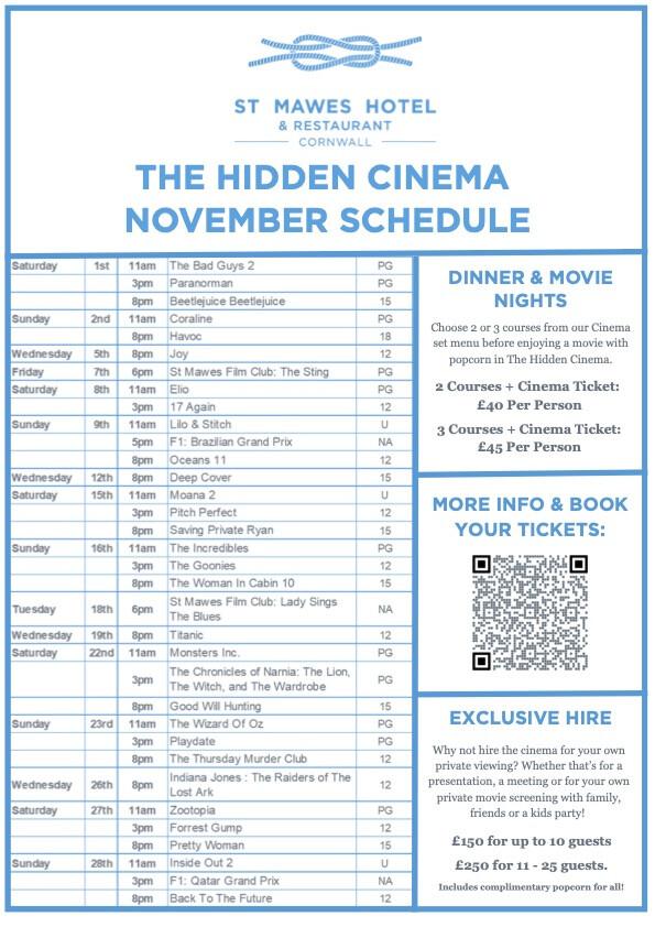 What's on this month at the Hidden Cinema, St Mawes Hotel
