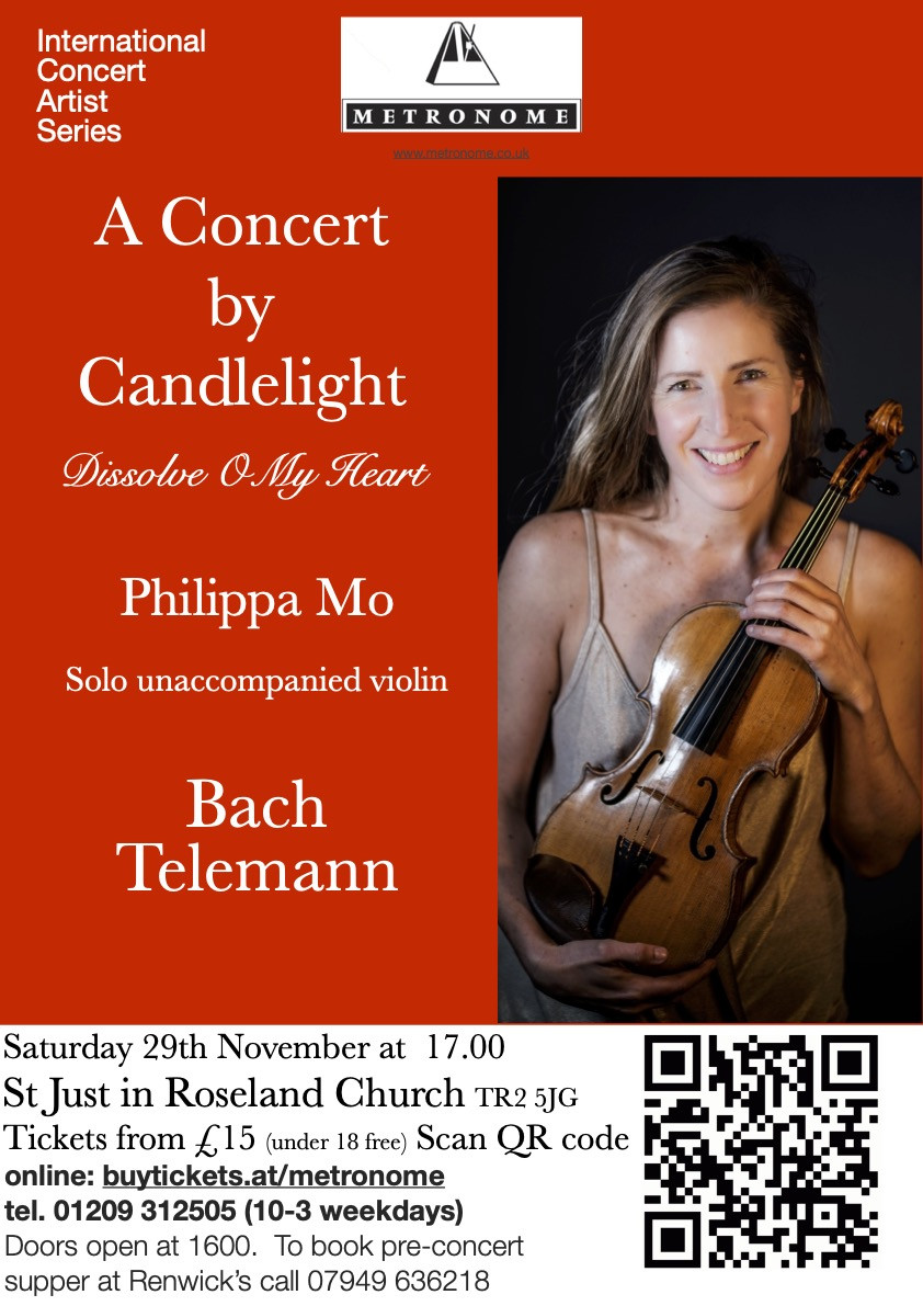 Enjoy a Concert by Candlelight at St Just in Roseland Church on 29th November. "Dissolve O My Heart" Philippa Mo solo violin plays unaccompanied Bach and Telemann.